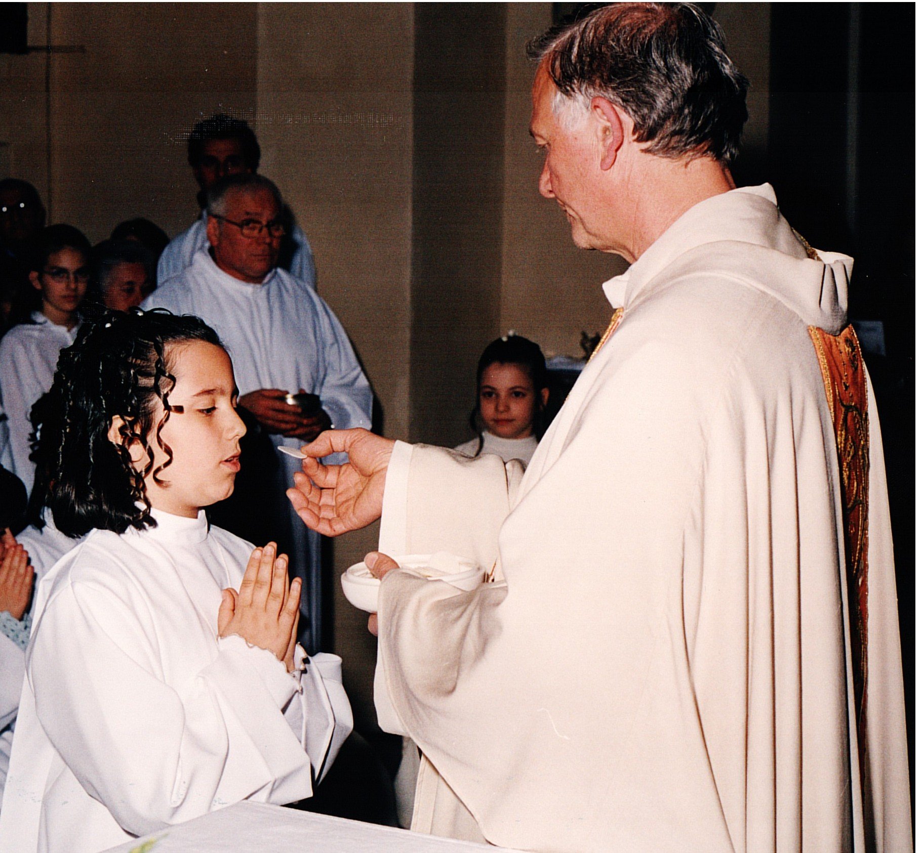 Eleonora riceve la Prima Comunione nella sua parrocchia, assieme ai suoi compagni di catechismo.